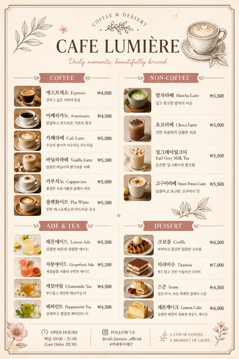 感性カフェ、ブランチカフェ、デザートカフェなど、さまざまなカフェスタイルに合ったメニューボードデザインをAIで生成するプロンプトです。暖かいブラウン・クリームトーンの高級感あるレイアウトに飲み物・デザートの写真と価格がきれいに整理されており、実際のカフェでそのまま使用できるメニューボードモックアップ画像を作成できます。メニュー名と価格を変更するだけで、どのカフェにも適用可能です。