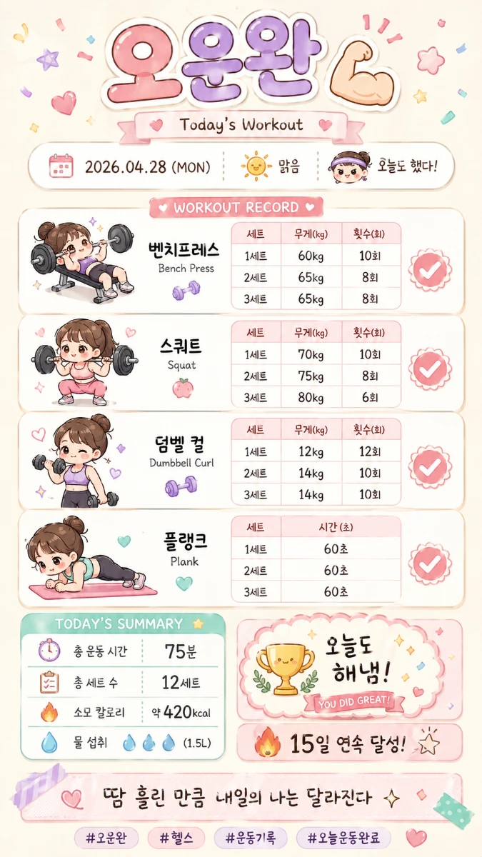 かわいくて美しいワークアウト完了カード(オウンワンカード)を作成してください
