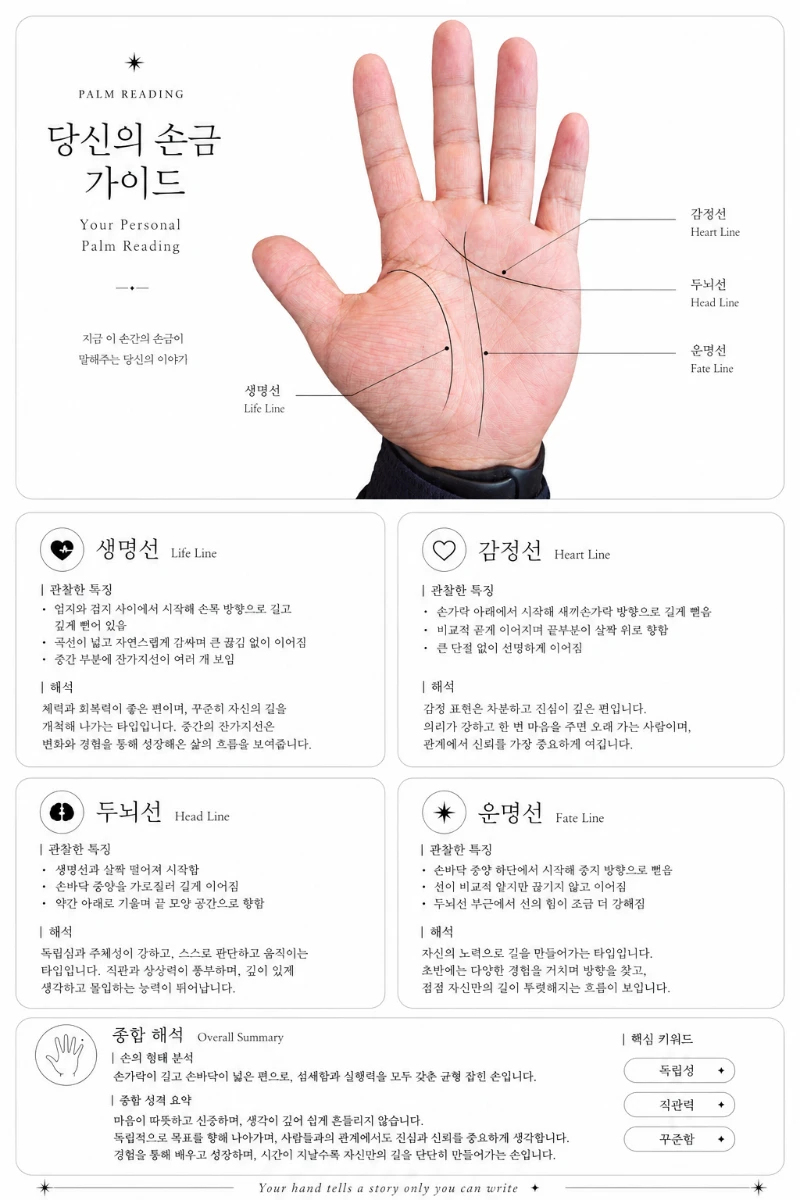私の手に基づいて、完全な手相リーディングガイドを作成してください。