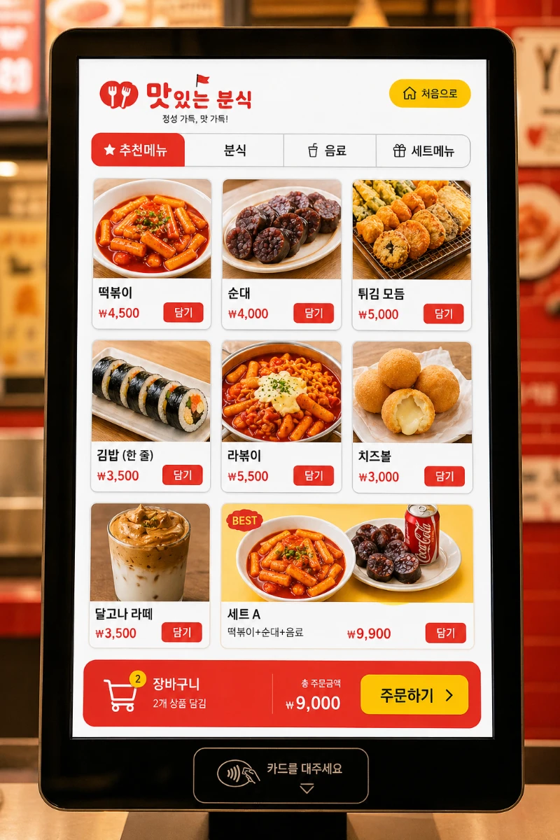 Create a high-quality tablet kiosk menu screen UI design mockup for a Korean fast food and street food restaurant (분식집).