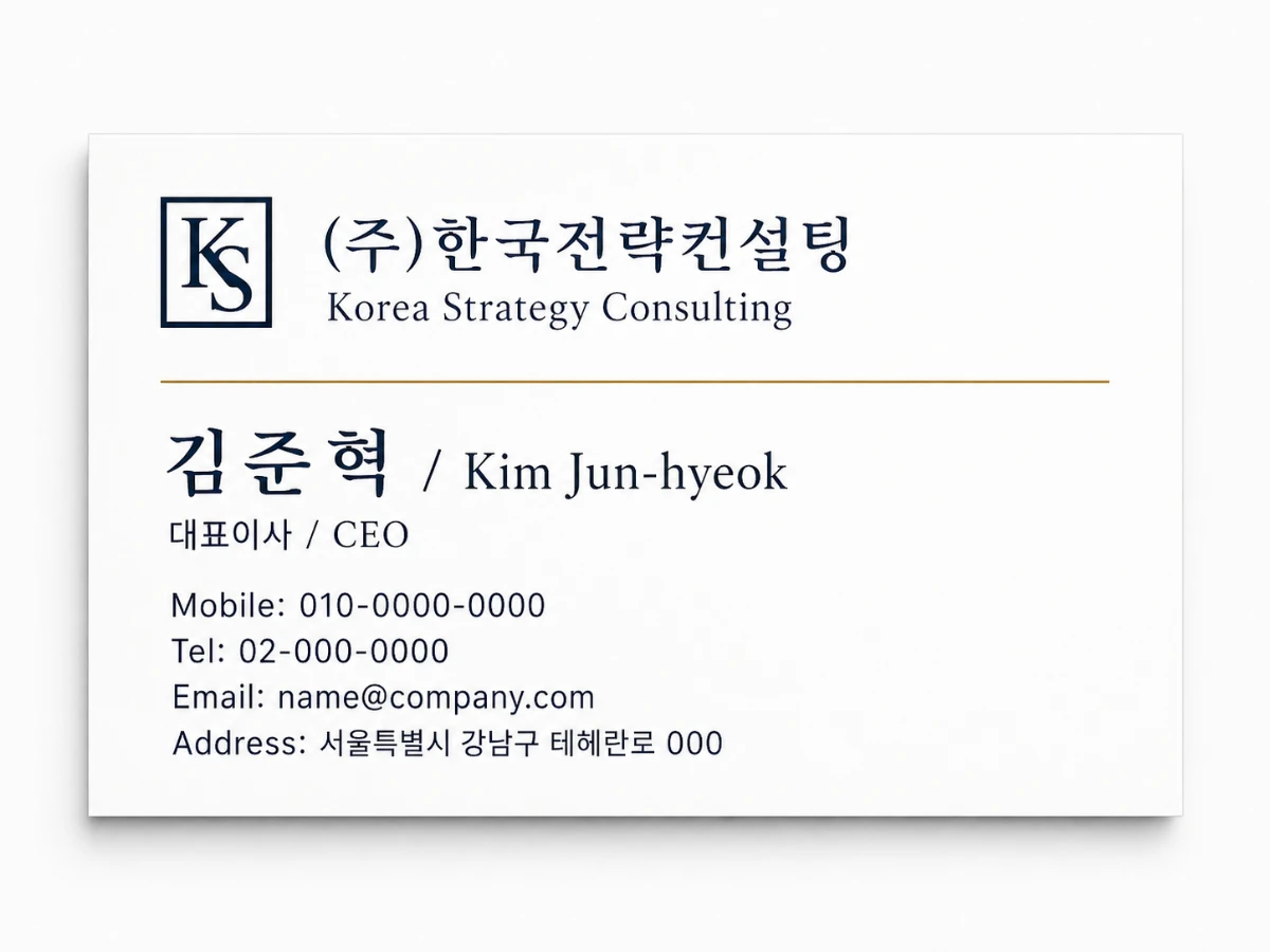 법무법인, 금융사, 컨설팅, 대기업 등 신뢰감과 격식이 중요한 보수적 기업에 어울리는 명함 디자인을 AI로 생성하는 프롬프트입니다. 절제된 색상, 고급 레이아웃, 세리프 폰트 조합으로 전문성과 신뢰감을 동시에 표현합니다. 이름·직함·연락처만 바꾸면 다양한 업종에 바로 적용할 수 있습니다.